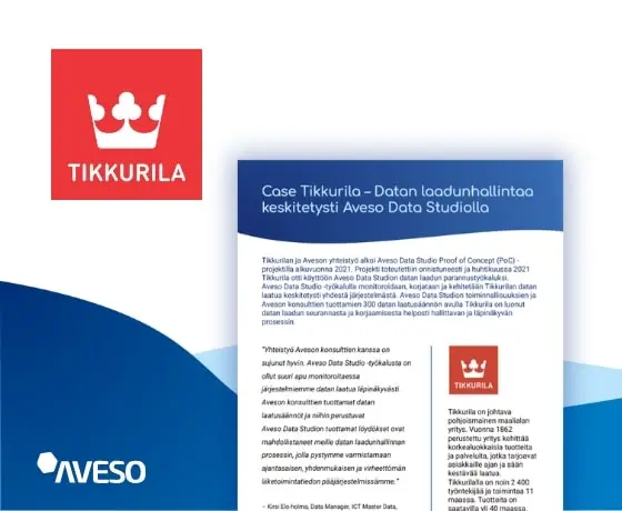 Tikkurila otti käyttöön Aveso Data Studio -työkalun parantaakseen datan laatua ja luodakseen datan laadun seurannasta ja korjaamisesta läpinäkyvän prosessin. Lataa PDF-tiedosto ja näe, miten projektit ovat onnistuneet.